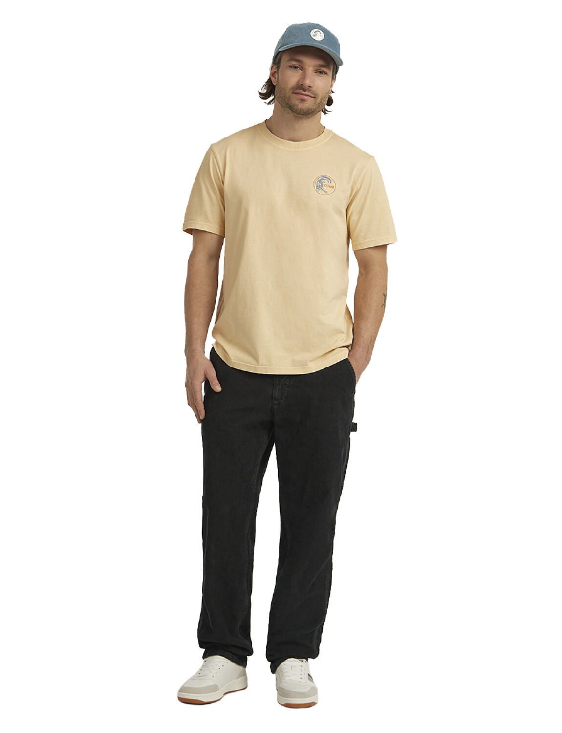 El color cálido y el diseño retro la hacen perfecta para combinar con denim, bermudas o boardshorts. Es una remera que levanta cualquier outfit sin esfuerzo, manteniendo un estilo relajado pero con identidad.